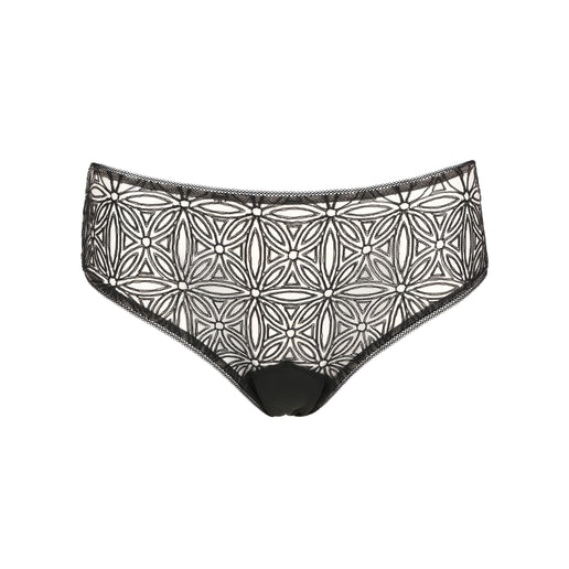 The Infini briefs offer a harmonious blend of elegance and sensuality. Crafted from black Swiss geometric embroidery, they enhance the silhouette with a modern and refined style. The front features a feminine and timeless motif, while the open back adds a seductive and contemporary touch.