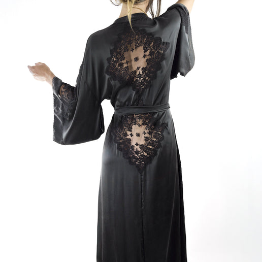 Shell Belle Couture Florence Silk Long Kimono - Stunning Florence Long Kimono is beautifully crafted in sand washed silk with applique lace detail. The lace veil shape was sourced from vintage lace archives and re-made exclusively for ourselves. Vintage half diamond on the wide kimono sleeve and two lace diamonds sensually placed at the back. Deep folded cu and hem with eyelet lace inset on the band. A generous, luxurious shape to elevate your downtime. Separate generous wide Silk belt, side Silk belt loops. Generous proportions for the ultimate luxurious lounging experience. This timeless vintage-inspired style will become your heirloom piece of tomorrow. A beautiful, keepsake piece for your special occasion.
