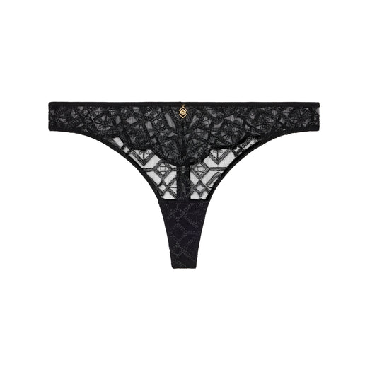 Sheer tulle panels introduce a refined touch of transparency, enhancing the intricate embroidery and creating an elegant play of contrasts. The flattering thong cut offers a smooth, minimal finish that sits invisibly under clothing while highlighting the natural curves. Delicate gold jewellery accents provide a luminous, elevated detail.