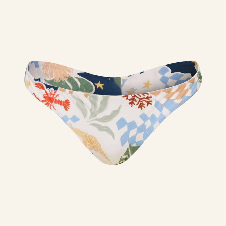 Watercult Seaside Tales Brazil Bikini Briefs - True vacation moments taken right out of a beach sketchbook – a new summer tale based on classical nautical themes. A joyful nautical trend revamp perennial prints via seaside motifs and upbeat colours creating a light hearted summer mood. The print let thoughts drift to seafood, collecting shells at sandy beaches, to sun, moon, and stars, and to this summer state of mind felt only when being by the ocean. Vivid coastal motifs of lobsters, shells, checkerboard, and stars are playing on light sand ground taking us to the nostalgic riviera. The print execution is with a hand painted and partly stamped character to underline a playful yet bold vibe. Decorative stitching decorates dividing seams on the retro-styled new bandeau bikini top. High-rise bottoms and the new tank suit feature twisted bows inserted in the side seams to underline the vintage vibe.